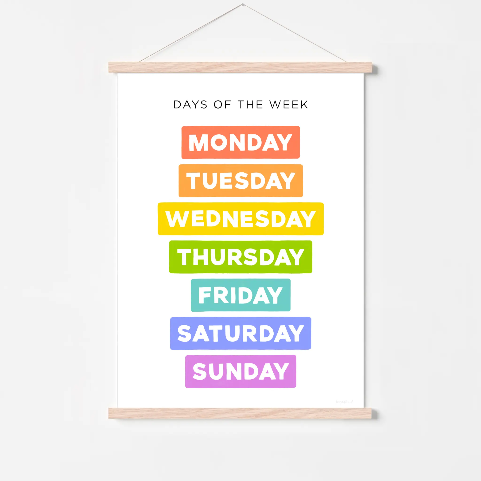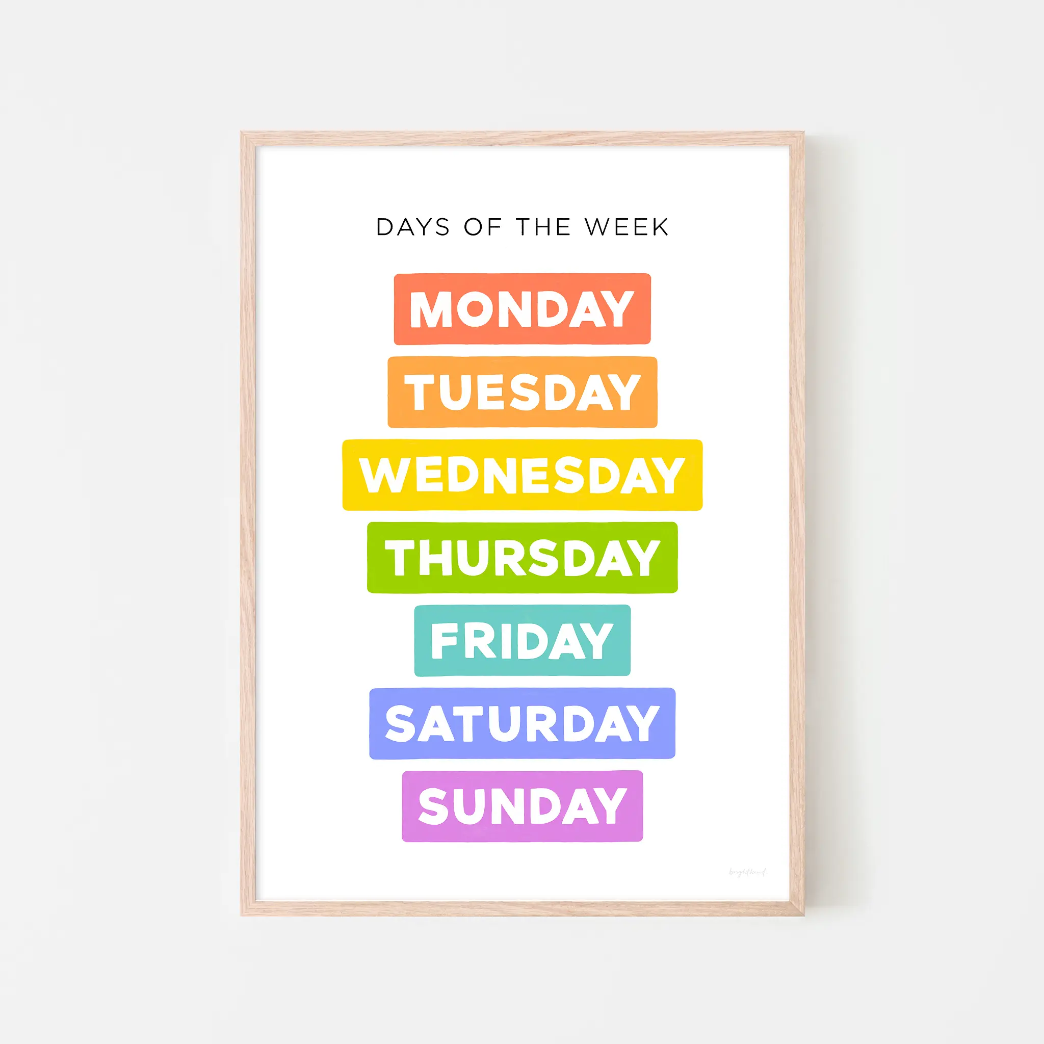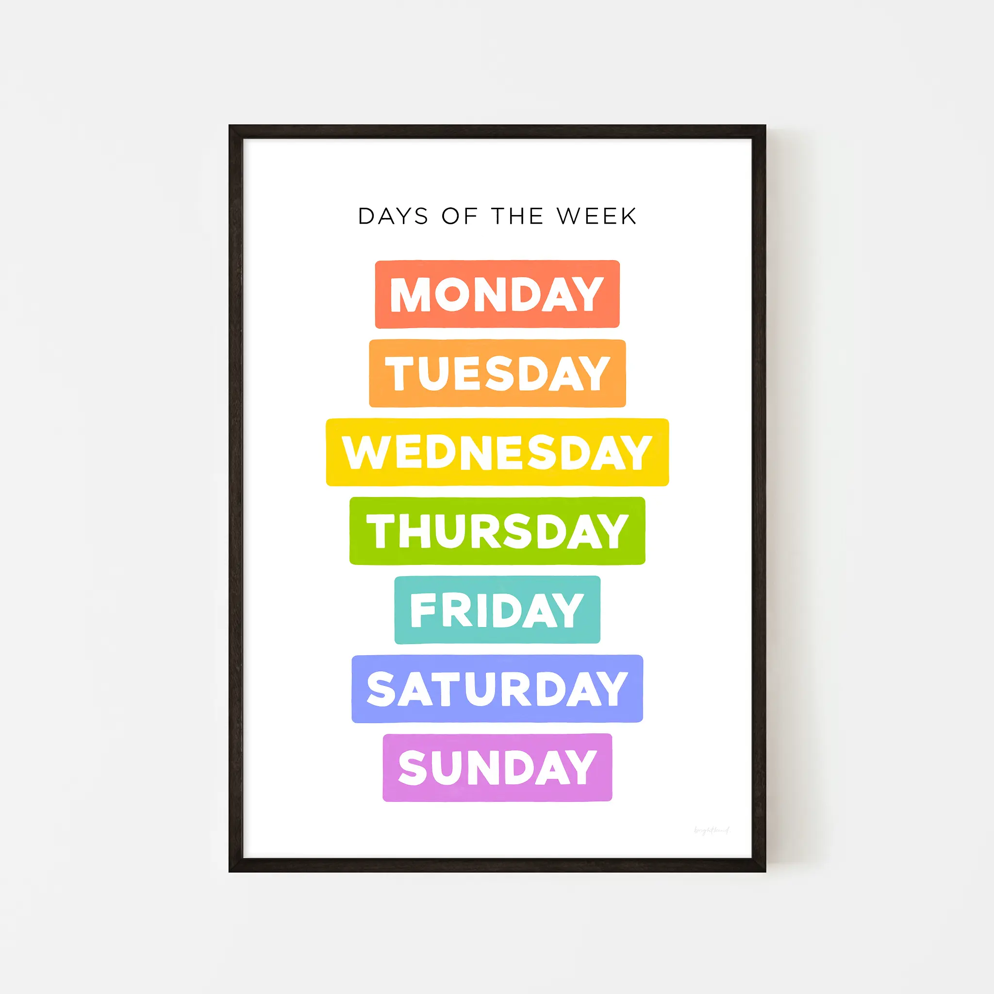 - The framed images shown for Days of the Week Educational Poster – Rainbow are for reference—please check the frame colour swatch for an accurate representation.