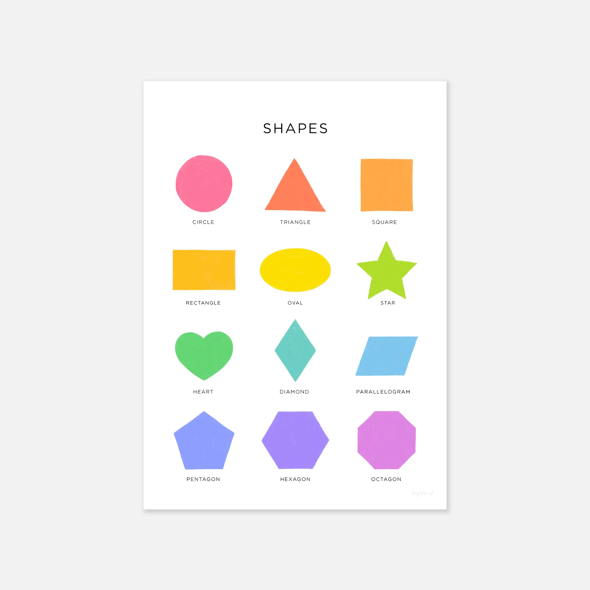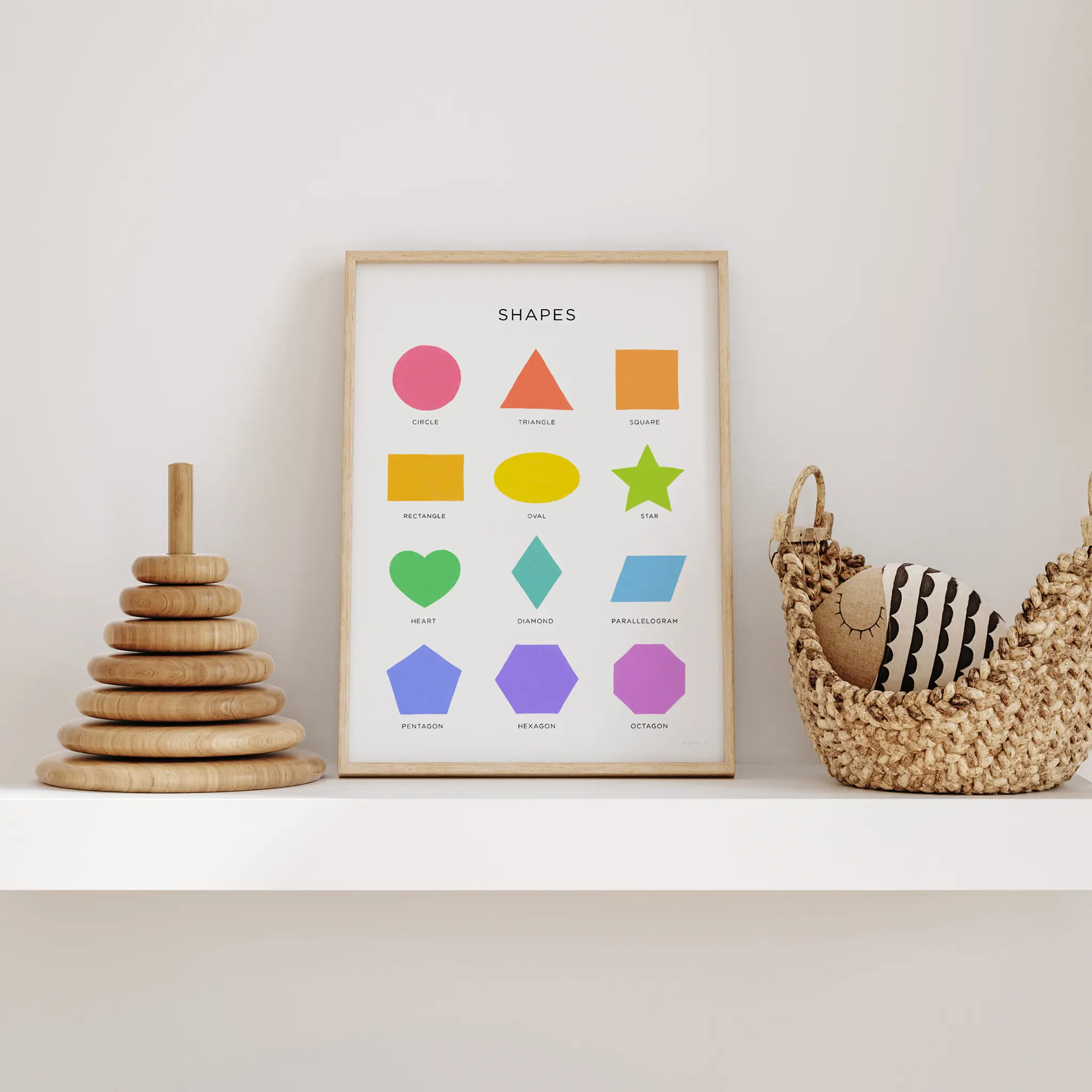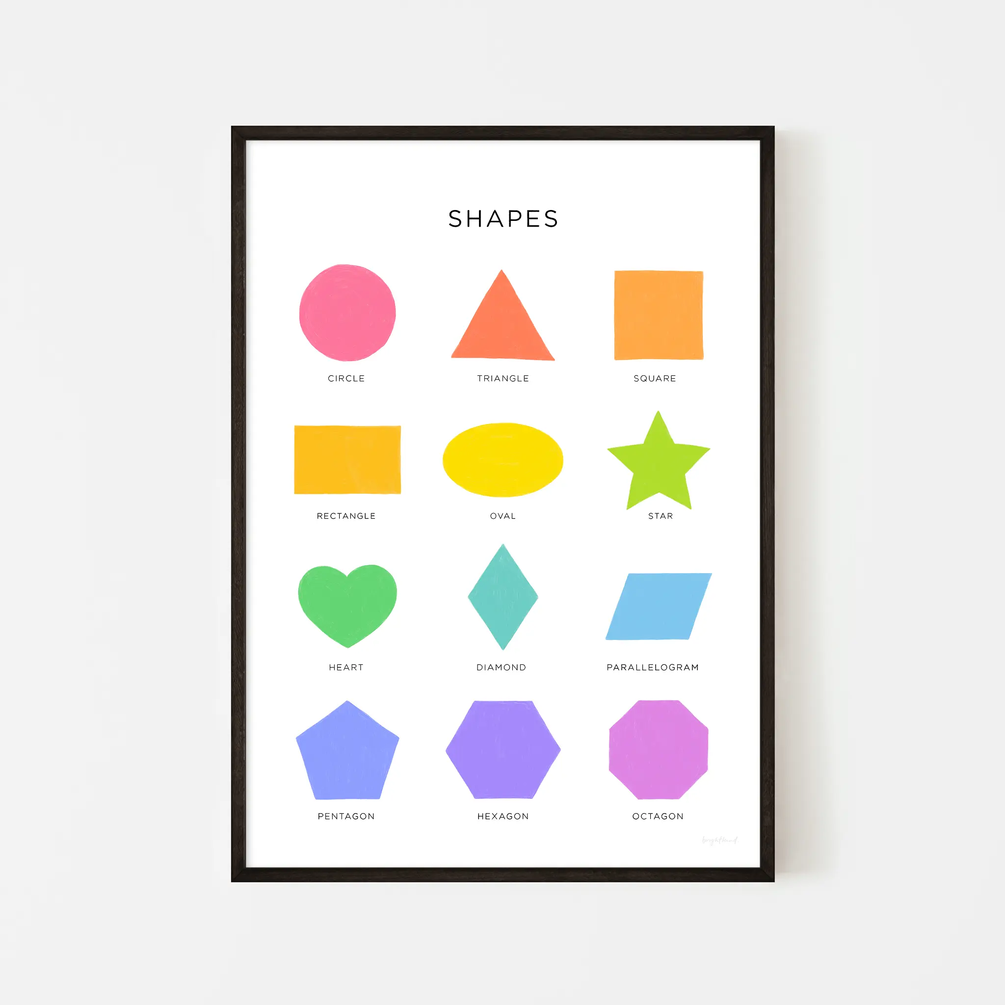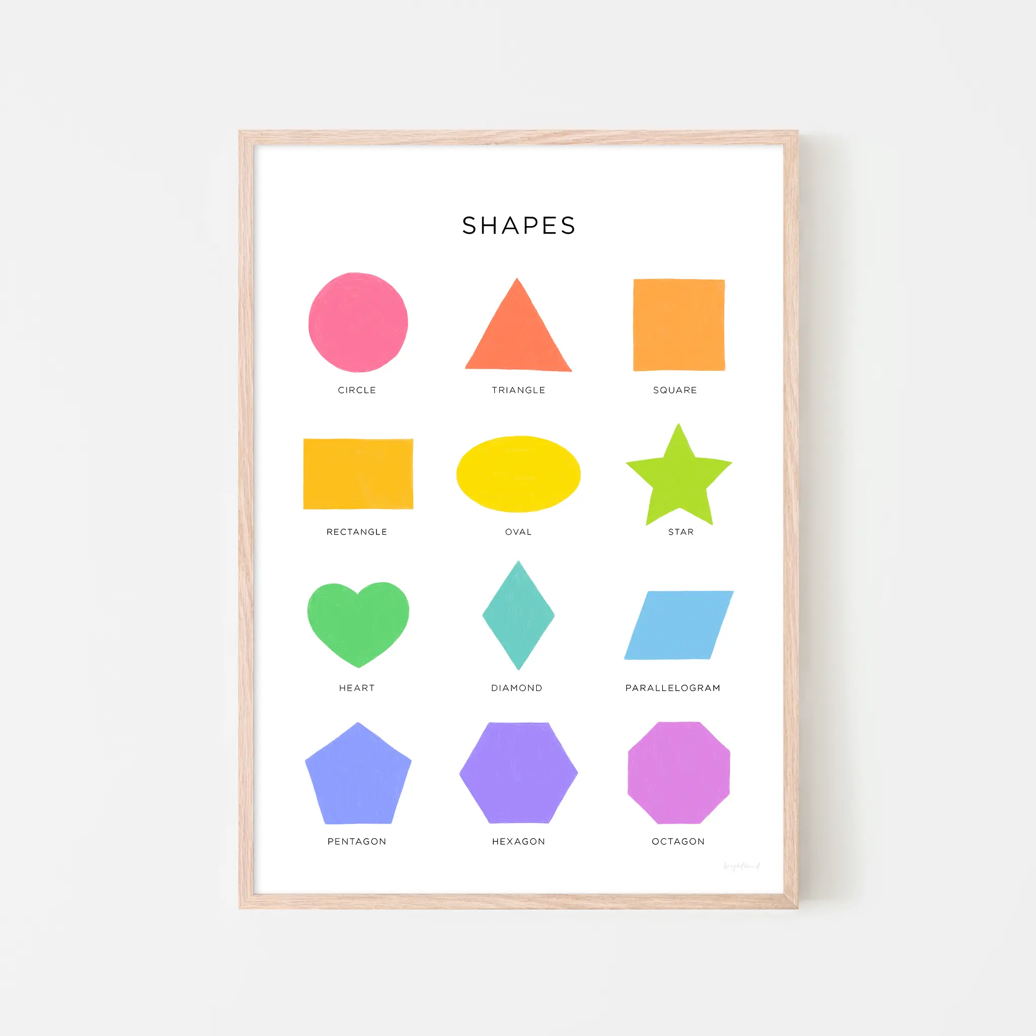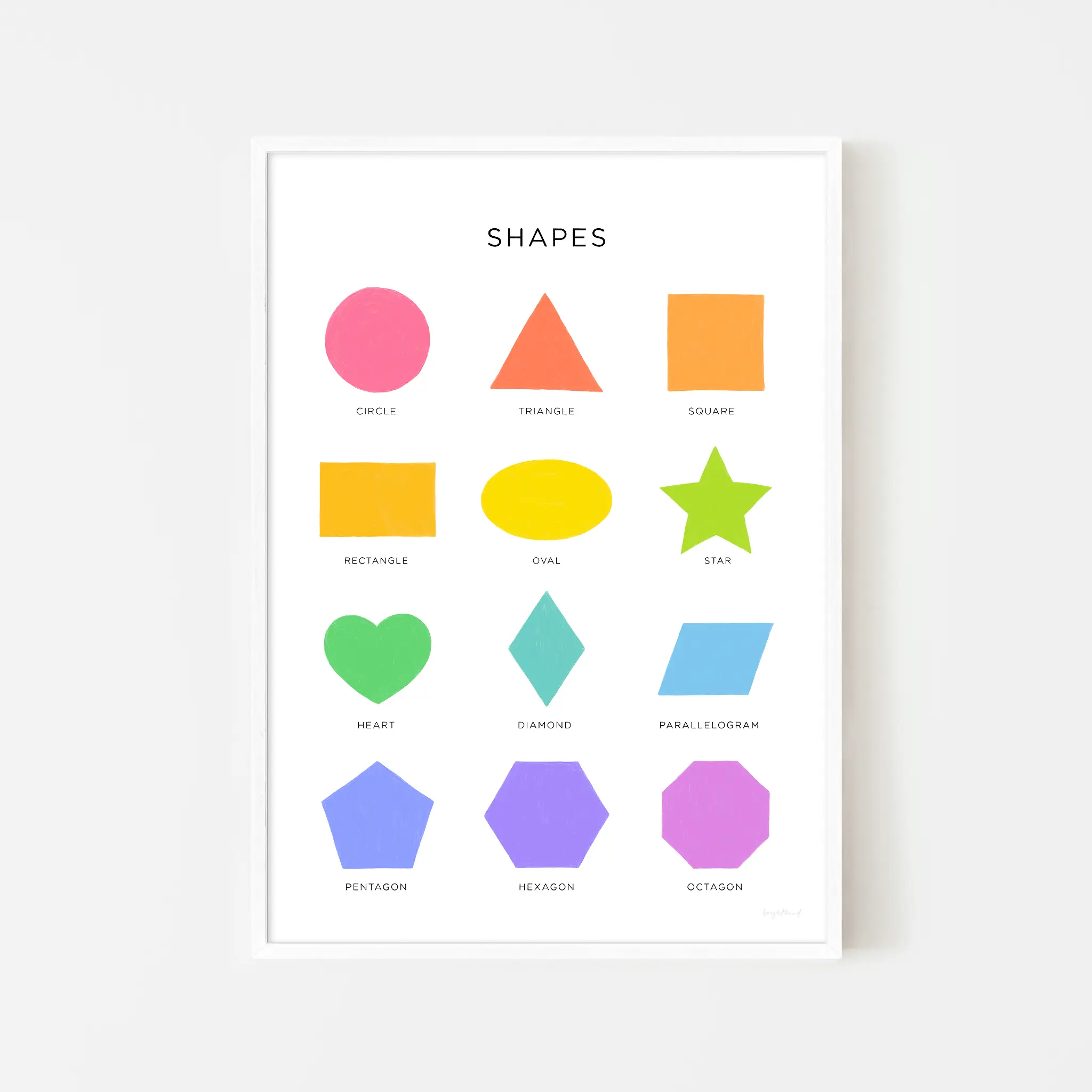 Make learning fun with Rainbow Shapes, a vibrant and engaging educational poster designed to help little learners recognise and name common shapes. Featuring bright, playful illustrations of twelve essential shapes—from circles and squares to hexagons and stars—this print is a perfect addition to nurseries, playrooms, and classrooms. With its hand-painted textures and bold colors, it turns early learning into a joyful experience, inspiring curiosity and creativity in young minds.