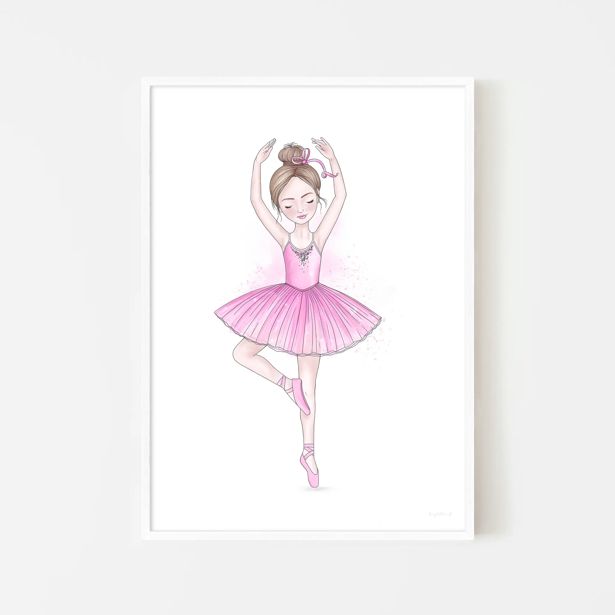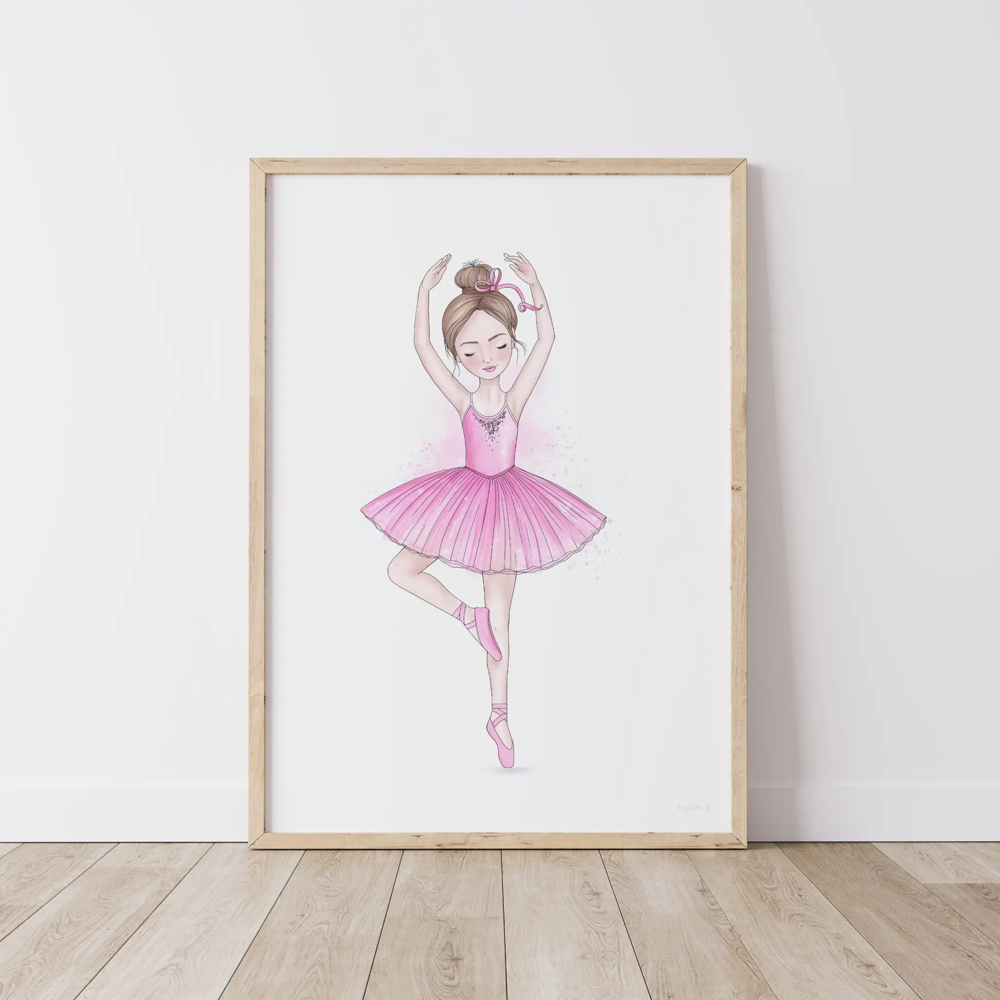A delicate and dreamy illustration capturing the beauty of ballet in motion. With her perfectly poised arabesque, flowing pink tutu, and twinkling embellishments, this ballerina radiates elegance and confidence. A stunning addition to any ballet lover’s room, nursery, or dance studio, this print brings a sense of movement and magic to any space. A must-have for little dreamers who love to twirl!