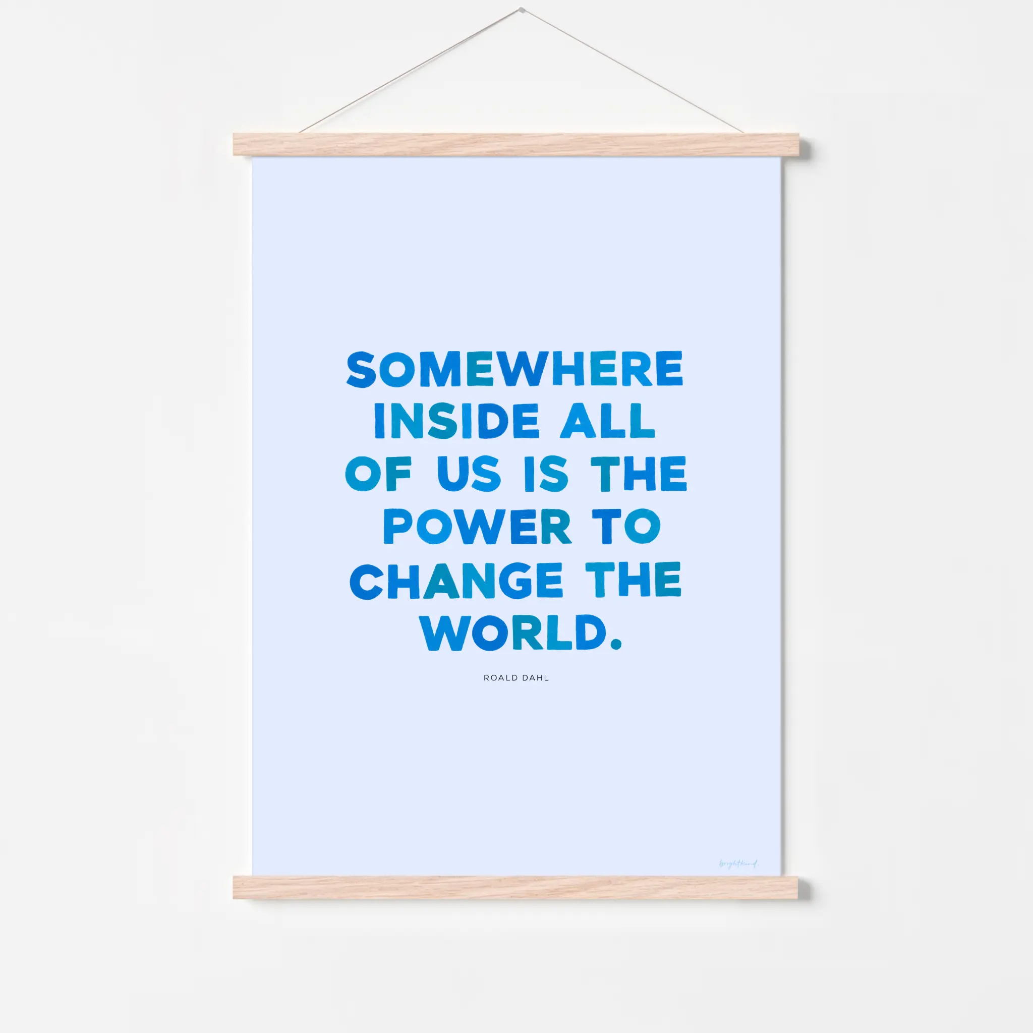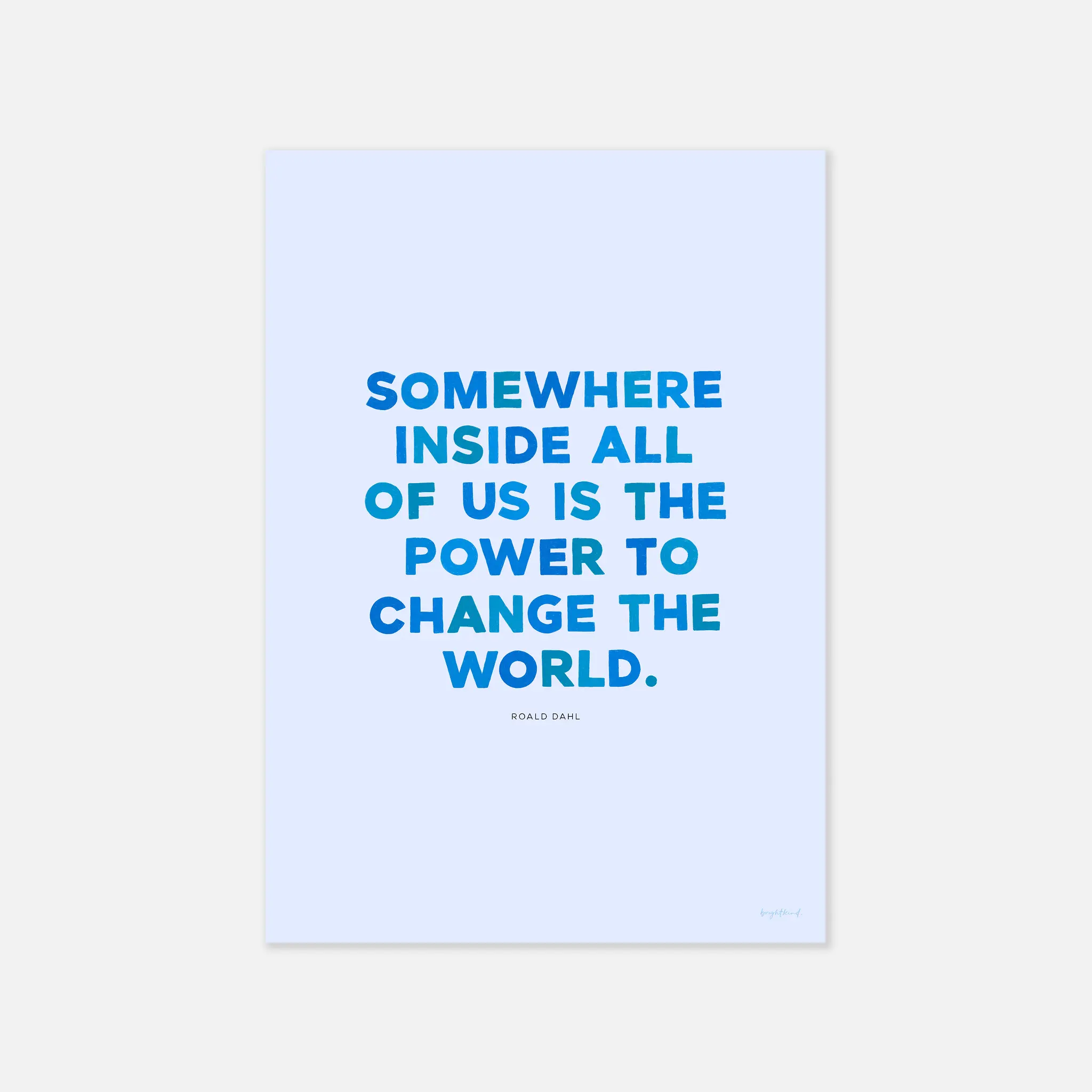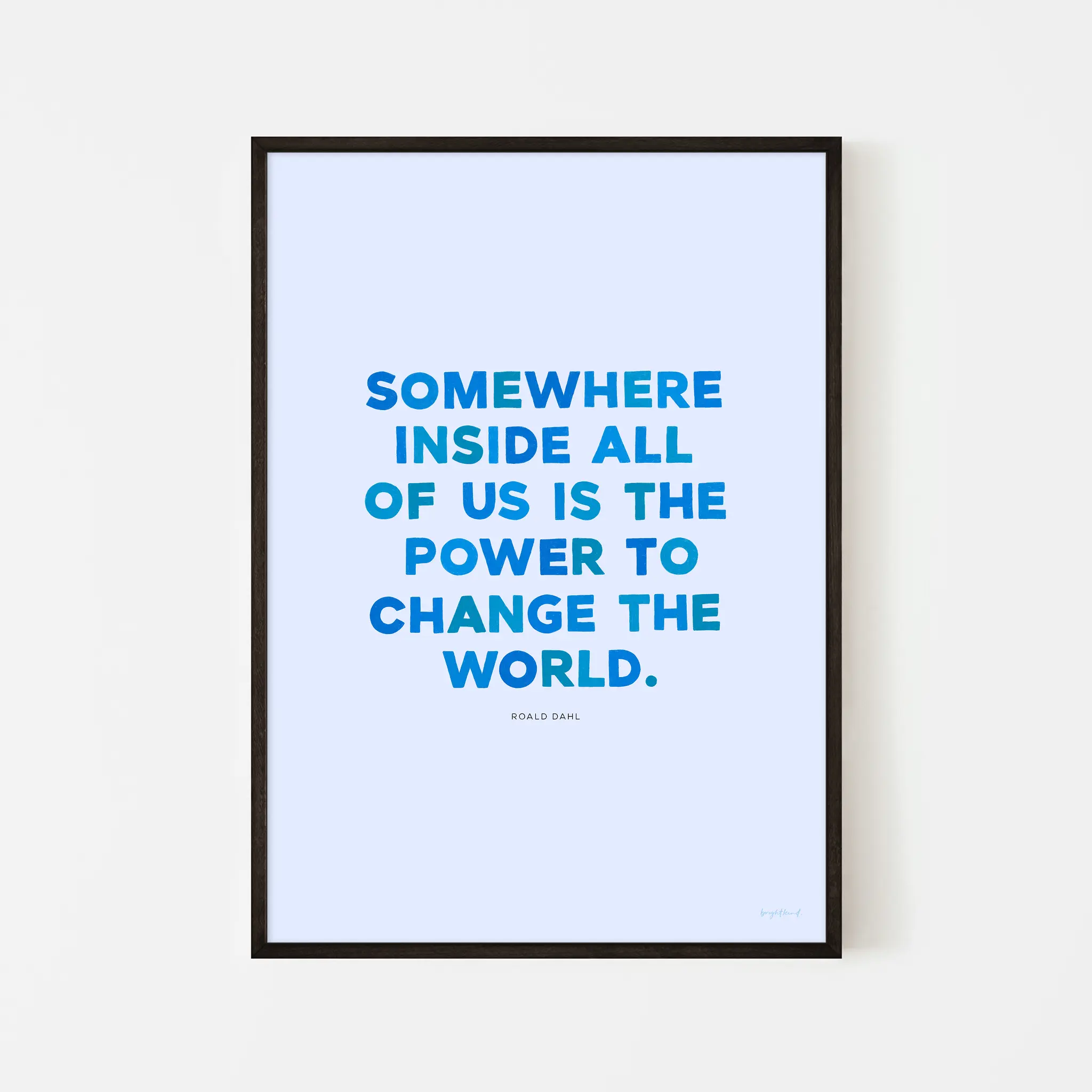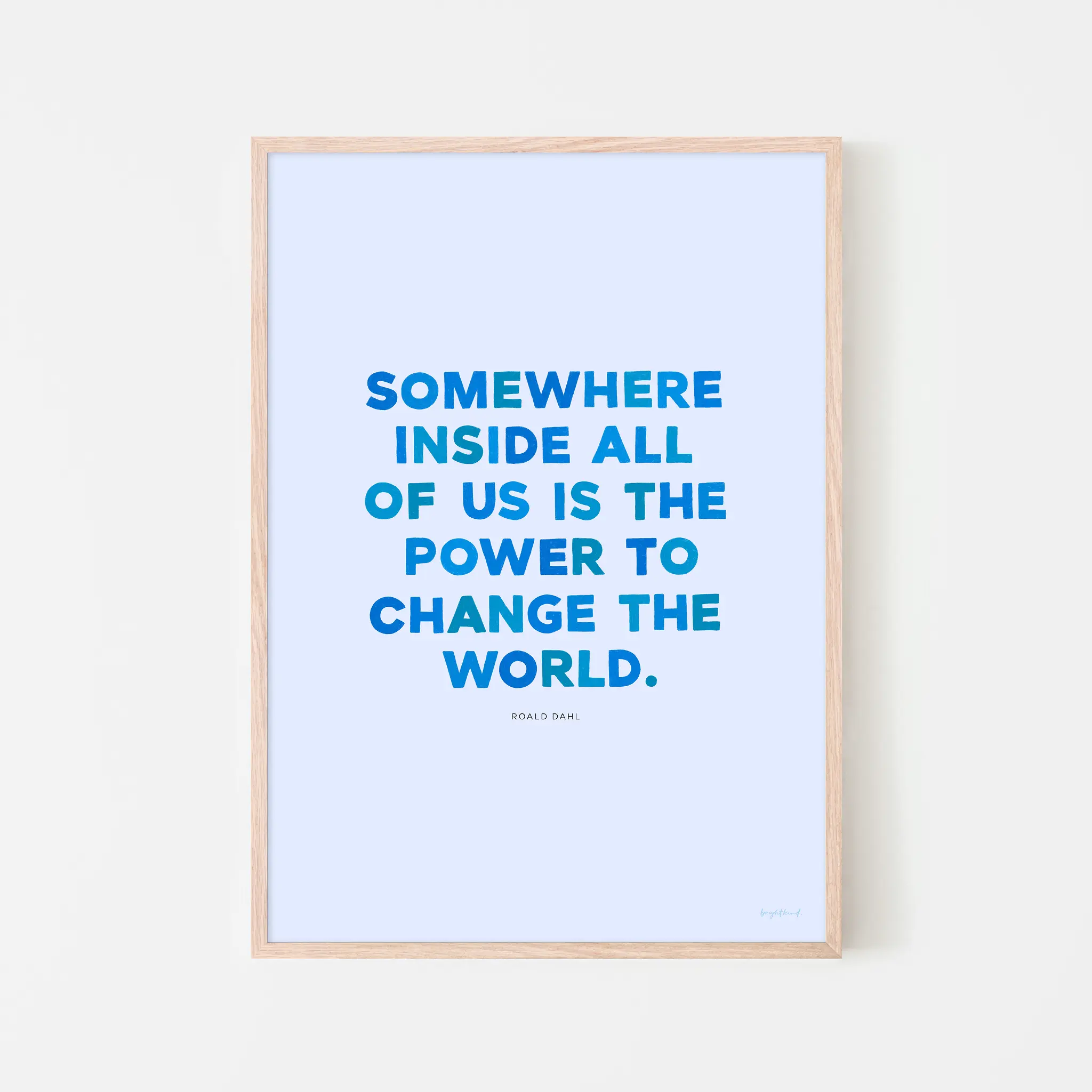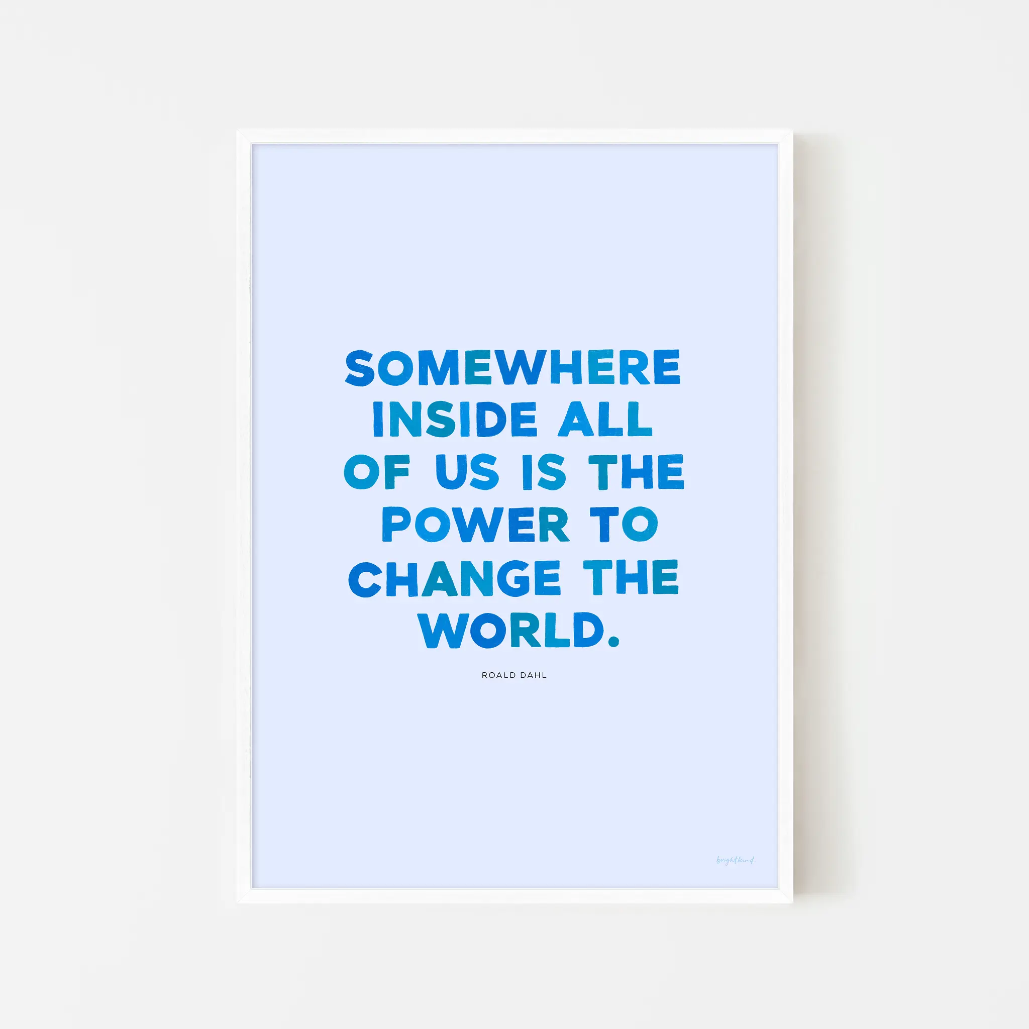 Let inspiration take flight with Power to Change the World – Blue Skies! This hand-lettered art print features the empowering words of Roald Dahl: “Somewhere inside all of us is the power to change the world.” Each letter is unique and hand-drawn. This refreshing Roald Dahl quote features bold blue typography on a soft sky-blue background, evoking a sense of clarity, confidence, and endless potential. Whether displayed in a nursery, study nook, or creative workspace, this piece is a daily reminder that the power to make a difference is already within us. Perfect for dreamers and doers alike!