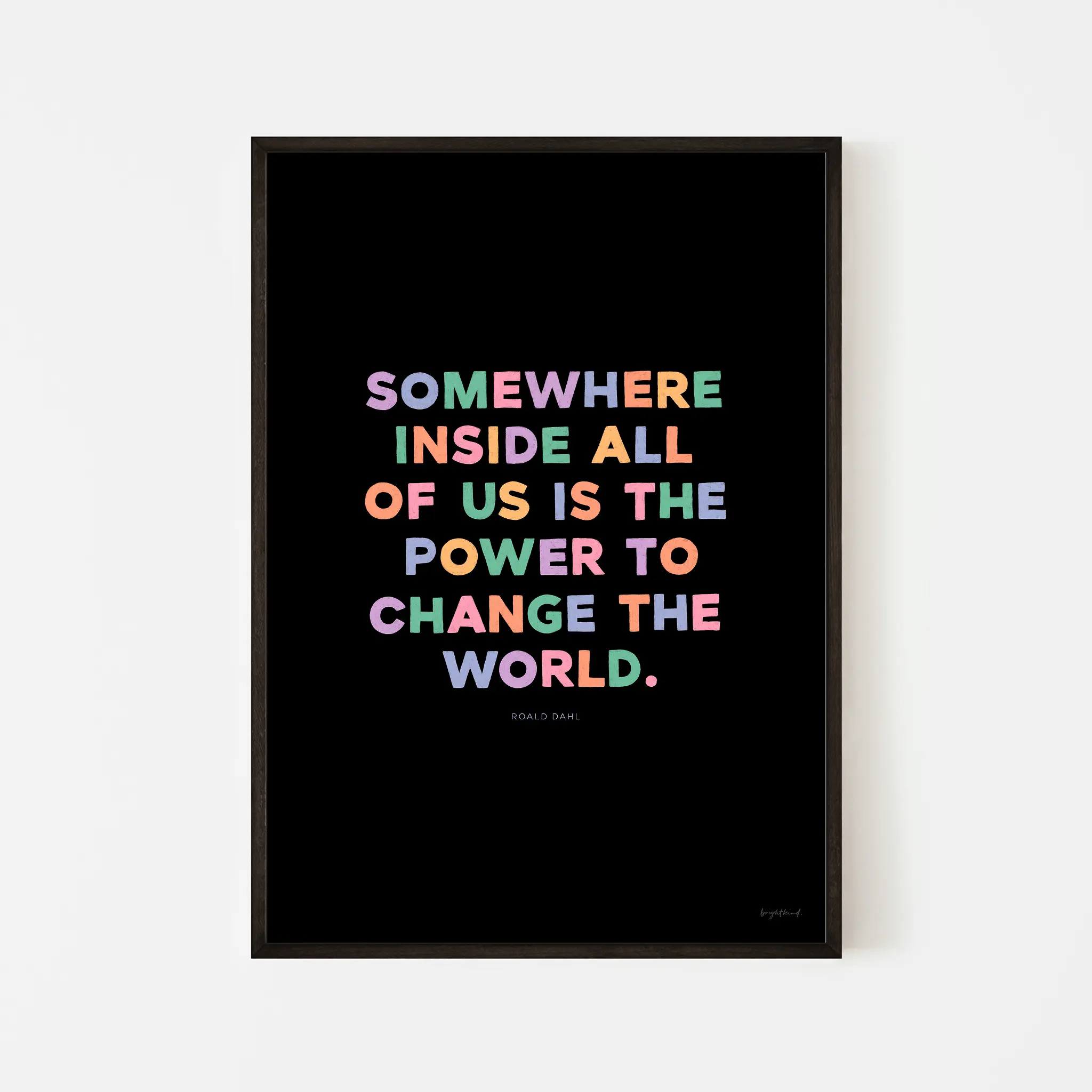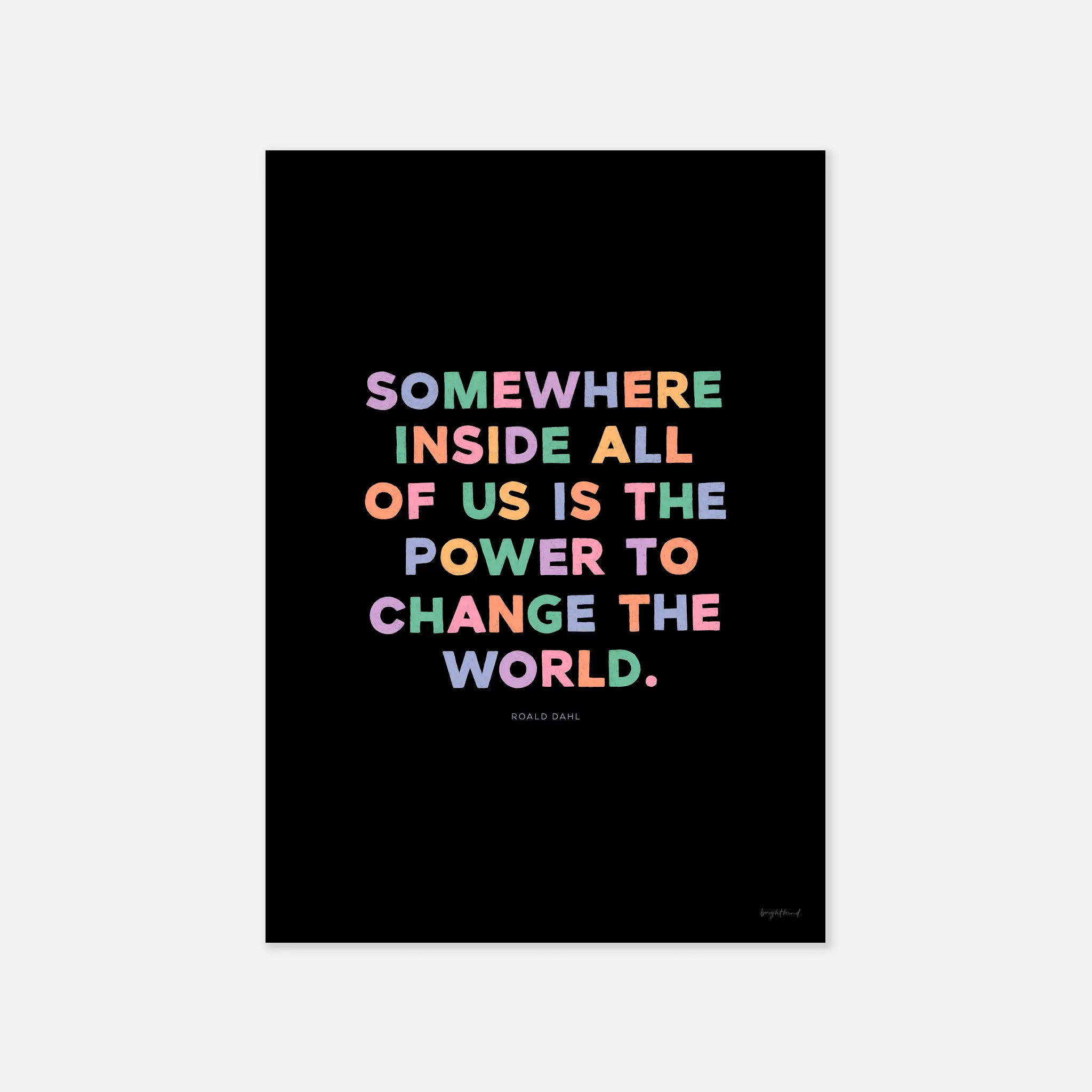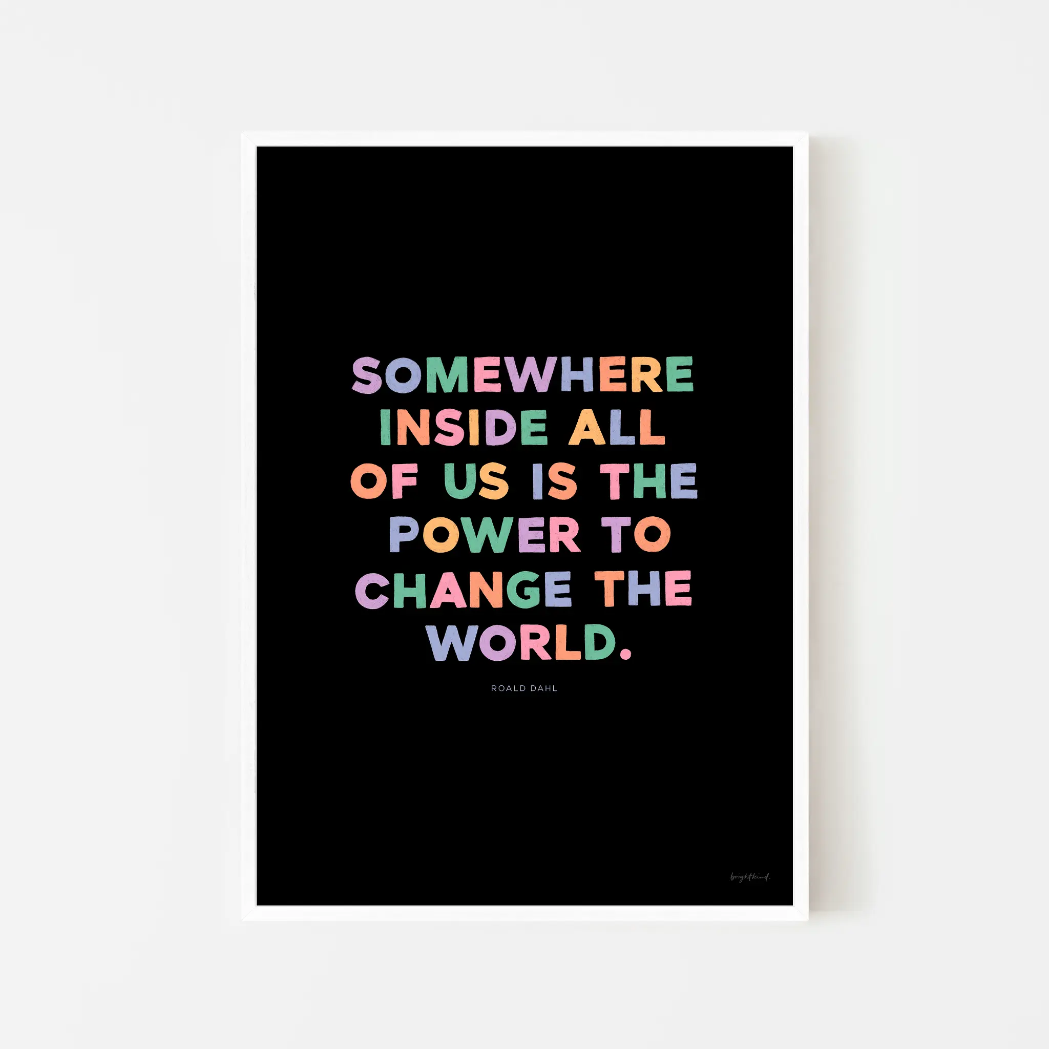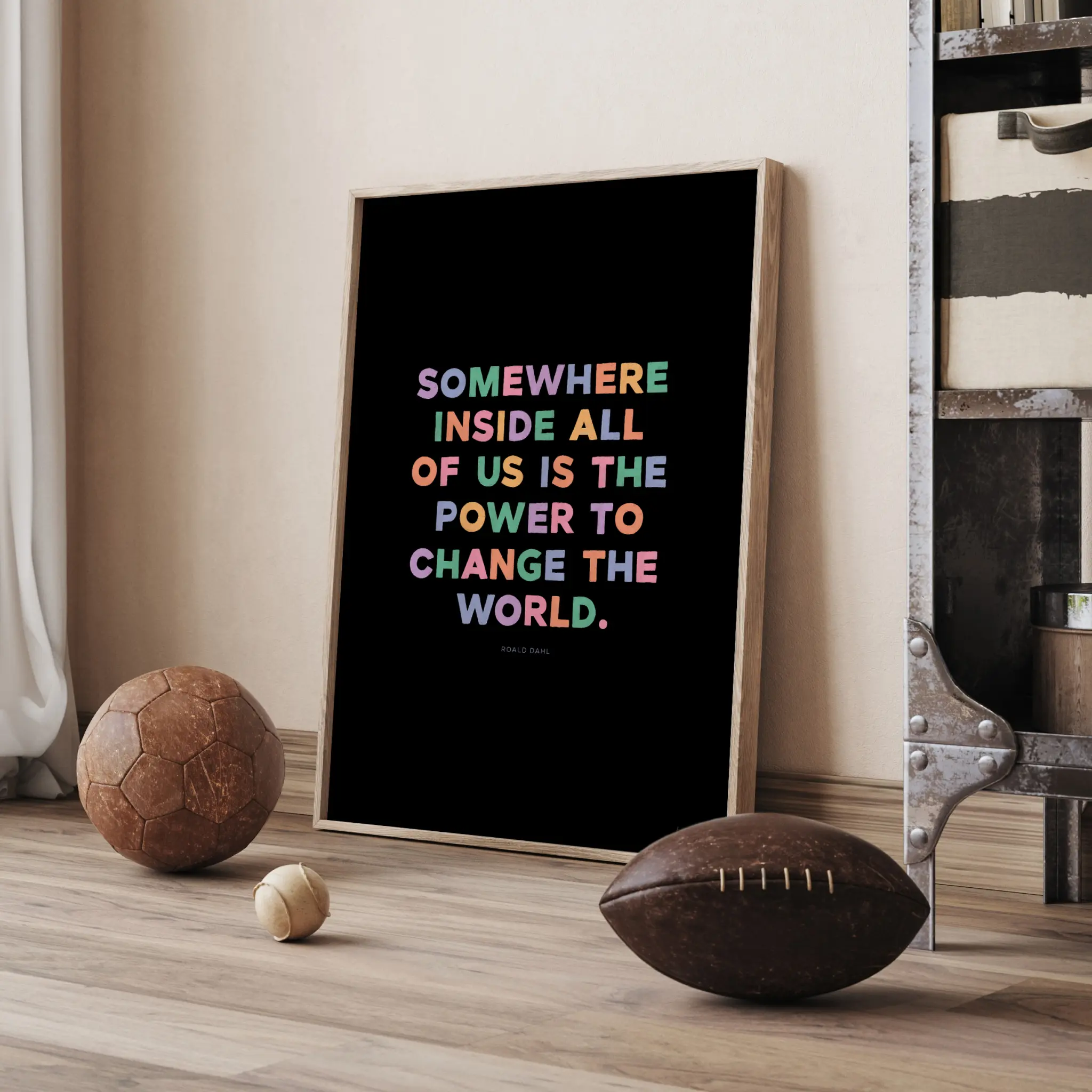 Set against a striking black background, the pastel rainbow typography pops with a sense of depth and mystery. This hand-lettered art print features the empowering words of Roald Dahl: “Somewhere inside all of us is the power to change the world.” Each letter is unique and hand-drawn. It is perfect for those who love a bold, modern aesthetic with an inspiring message. Ideal for kids’ rooms, creative spaces, or anywhere that needs a touch of motivation. A reminder that even in in darkness, there’s the power to create change, make a difference, and dream big.
