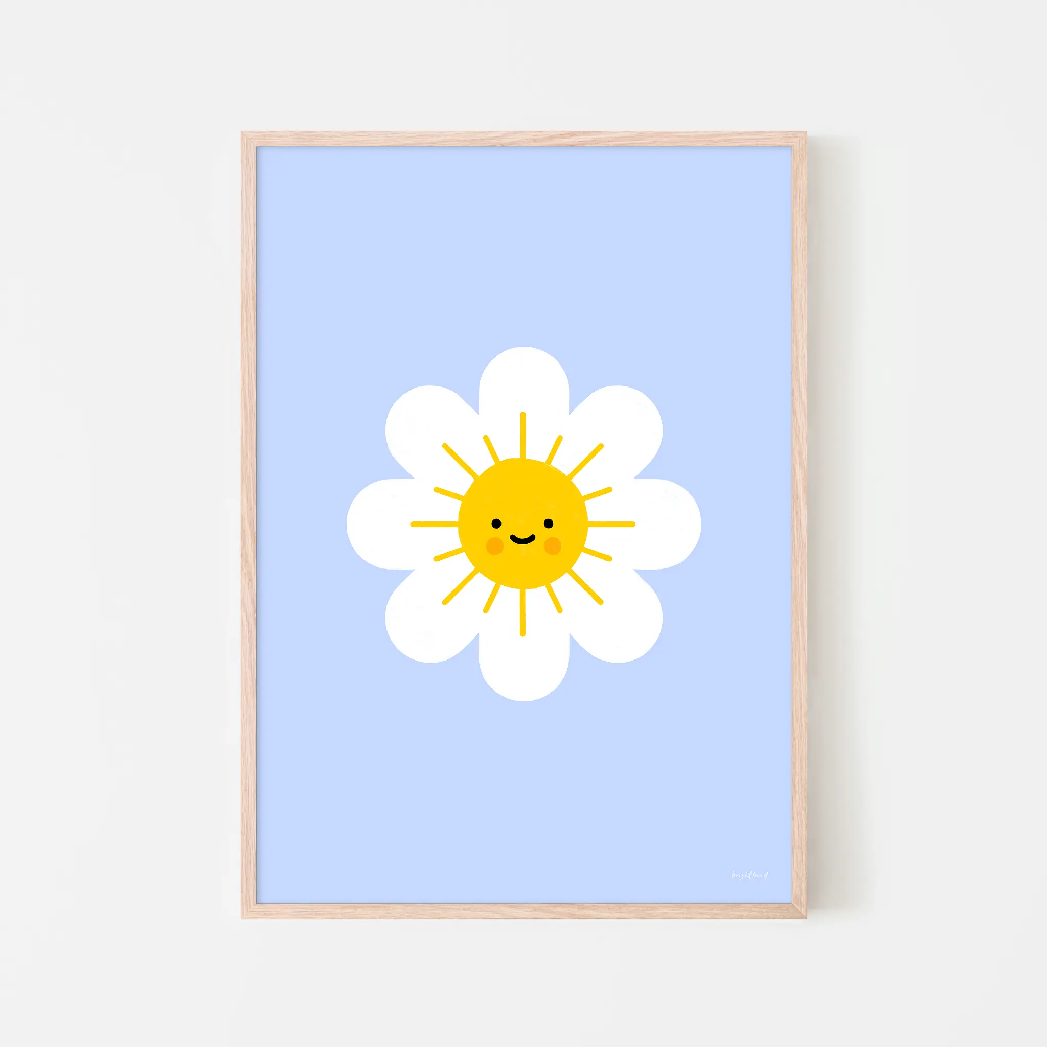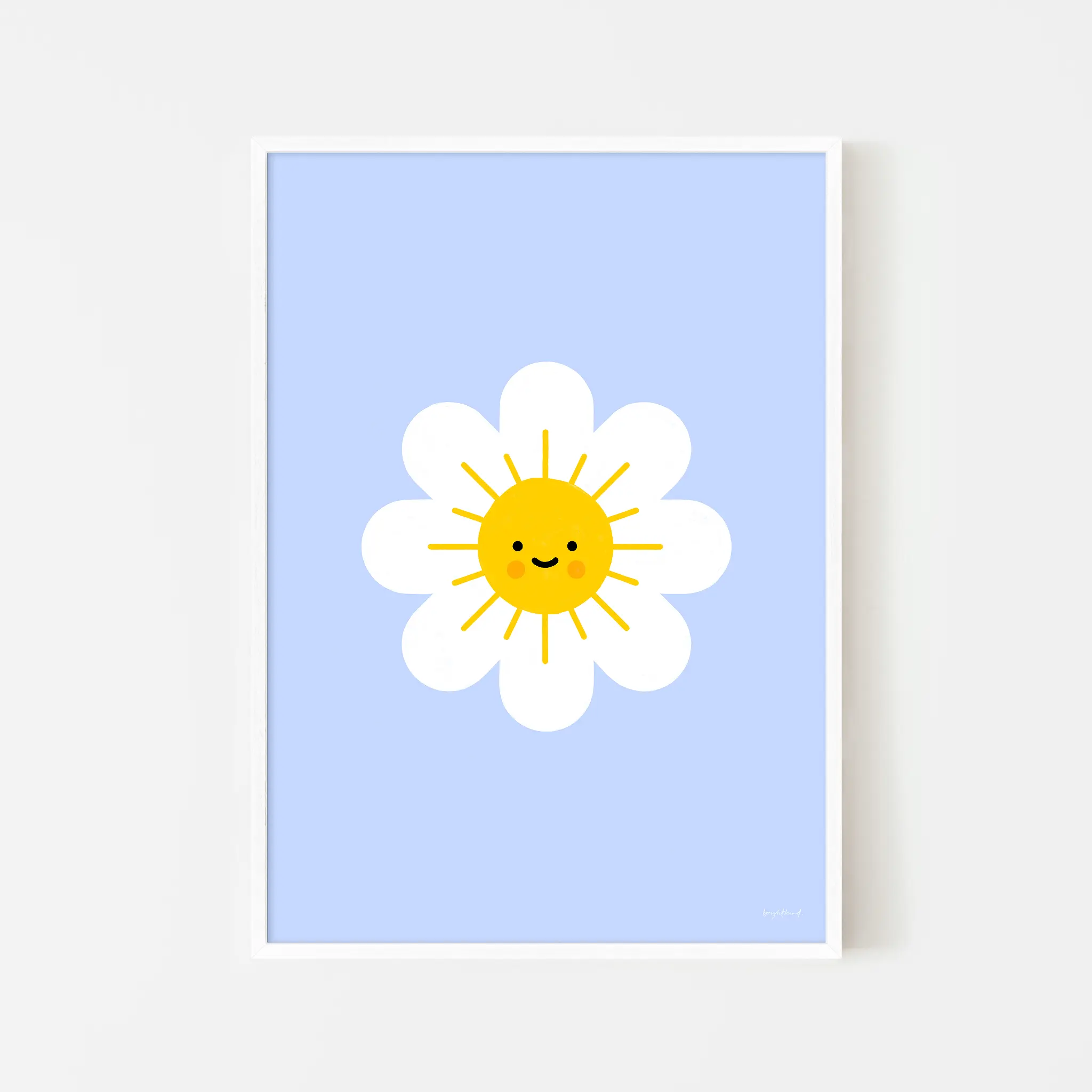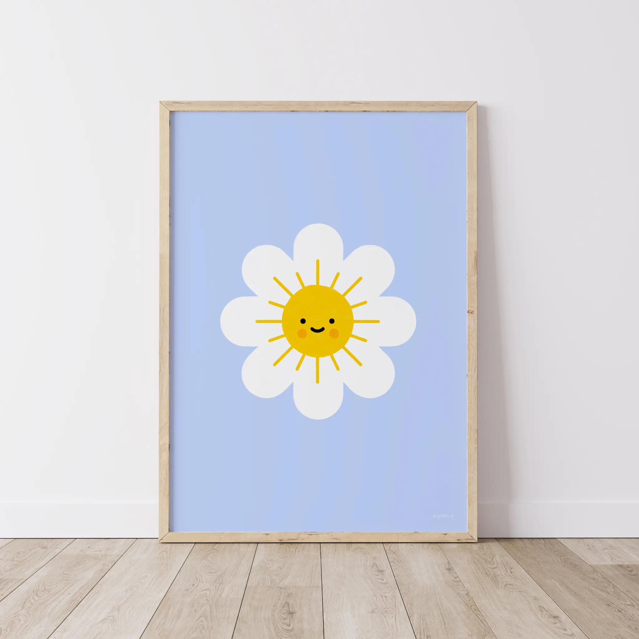 This adorable print blends the golden glow of the sun with the beauty of a flower, all set against a calming blue background. With its happy face and playful petals, this artwork is perfect for brightening nurseries, bedrooms, or any space that could use a touch of warmth and positivity. A simple yet joyful piece that brings a smile every time you see it!